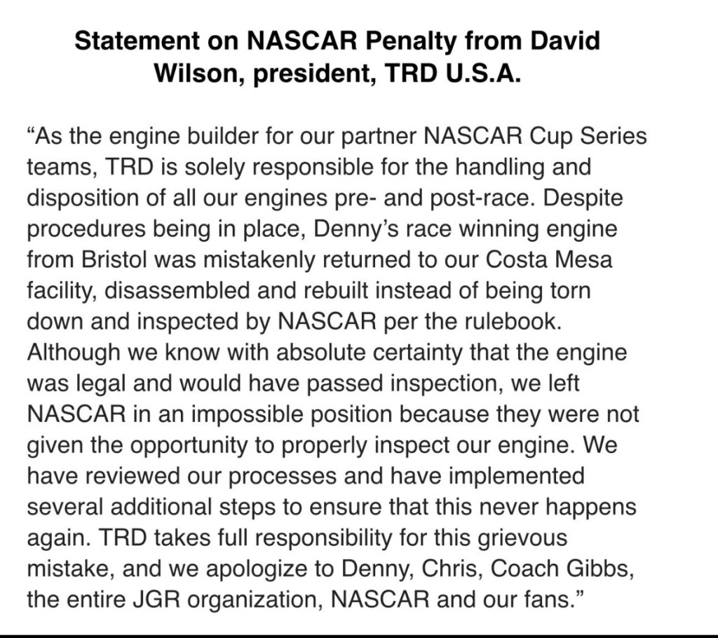 “Each race-winning engine must be inspected by NASCAR once the race team determines that its life cycle is complete. In this instance, priot to presenting the engine to NASCAR for inspection, TRD disassembled and rebuilt the No 11’s Bristol race winning engine. Per the NASCAR Rule Book, this violation results in an L2 penalty to the race team and driver. TRD self reported this violation”