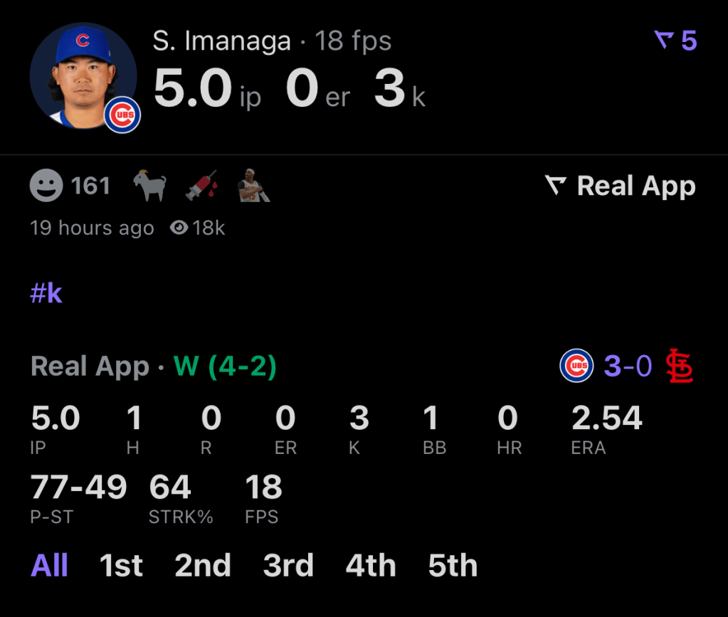 After suffering a hamstring injury on May 4th, Shota Imanga finally took back to the mound after an almost 2 month absence from play. Despite being on a low pitch count, Shota was able to strike out three batters through 5 innings pitched. The Cubs had been struggling lately with their pitching so the addition of Shota back into the rotation, will be a very big help for a team fighting for a postseason glory.