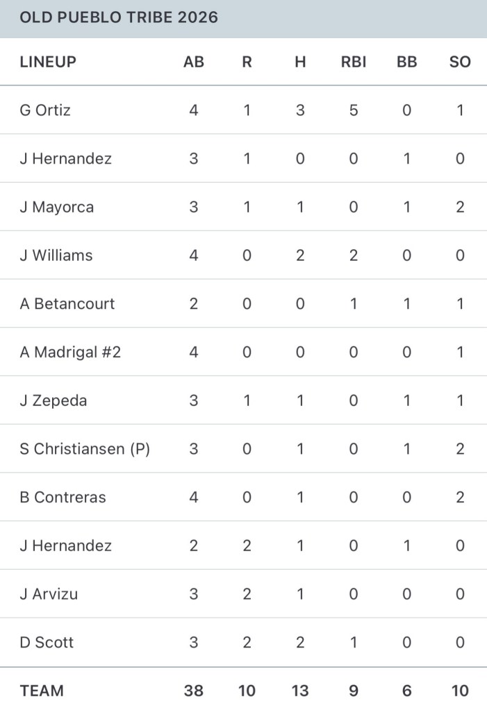 In the top of the eighth for Tribe Red, with Julian Zepada set to lead off, he worked a 2–2 count into a walk. Justin Hernandez followed and did the same. With two runners on, Arvizu knew Red needed another big moment. Sometimes, a big hit isn’t even necessary. Arvizu lifted a towering pop fly to left field that was dropped, allowing him to reach on an error and bringing Zepada home. Dajour Scott then rewarded Hernandez’s patience by driving him in with a 1-run RBI single, tying the game at six.