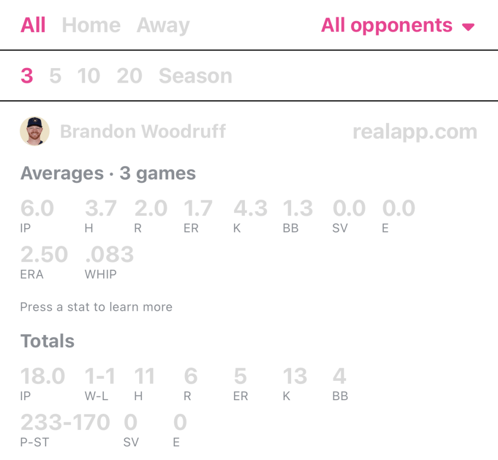 Brandon Woodruff has seen the most work out of anyone in the Brewers rotation, but has done a solid job. Woodruff relies on six pitches, with his four seam, changeup and sinker seeing a bulk of the work, with some sprinkles of a cutter, curveball and sweeper. Woodruff has a rough start versus the Red Sox on April 6th and is still trying to fix that ERA. ERA is kinda of an overlooked stat though, if we took away that one bad start, Woodruff’s ERA would currently be a 2.66. He’d have the 23rd best ERA in the league if we took away those five runs. Since then, Woodruff has recorded two quality starts since that April 6th game and his splits from the previous three games have been impressive.