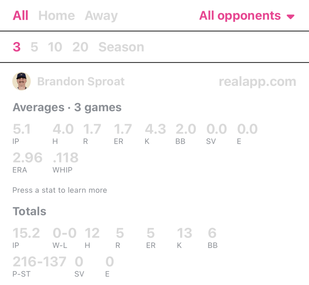 Brandon Sproat will be making just his sixth start of the 2026 campaign this series. He is still looking for his first scoreless start of the season. In all five of his starts, Sproat has allowed 16 runs with 20 strikeouts. His last three starts have been better though, only allowing five runs during that time, for a 2.96 ERA during that split. Sproat is starting to finally figure it out, and with a team that places top 10 in OPS, BA, TB, 2B and 3B’s, this will be Sproat’s biggest test thus far.